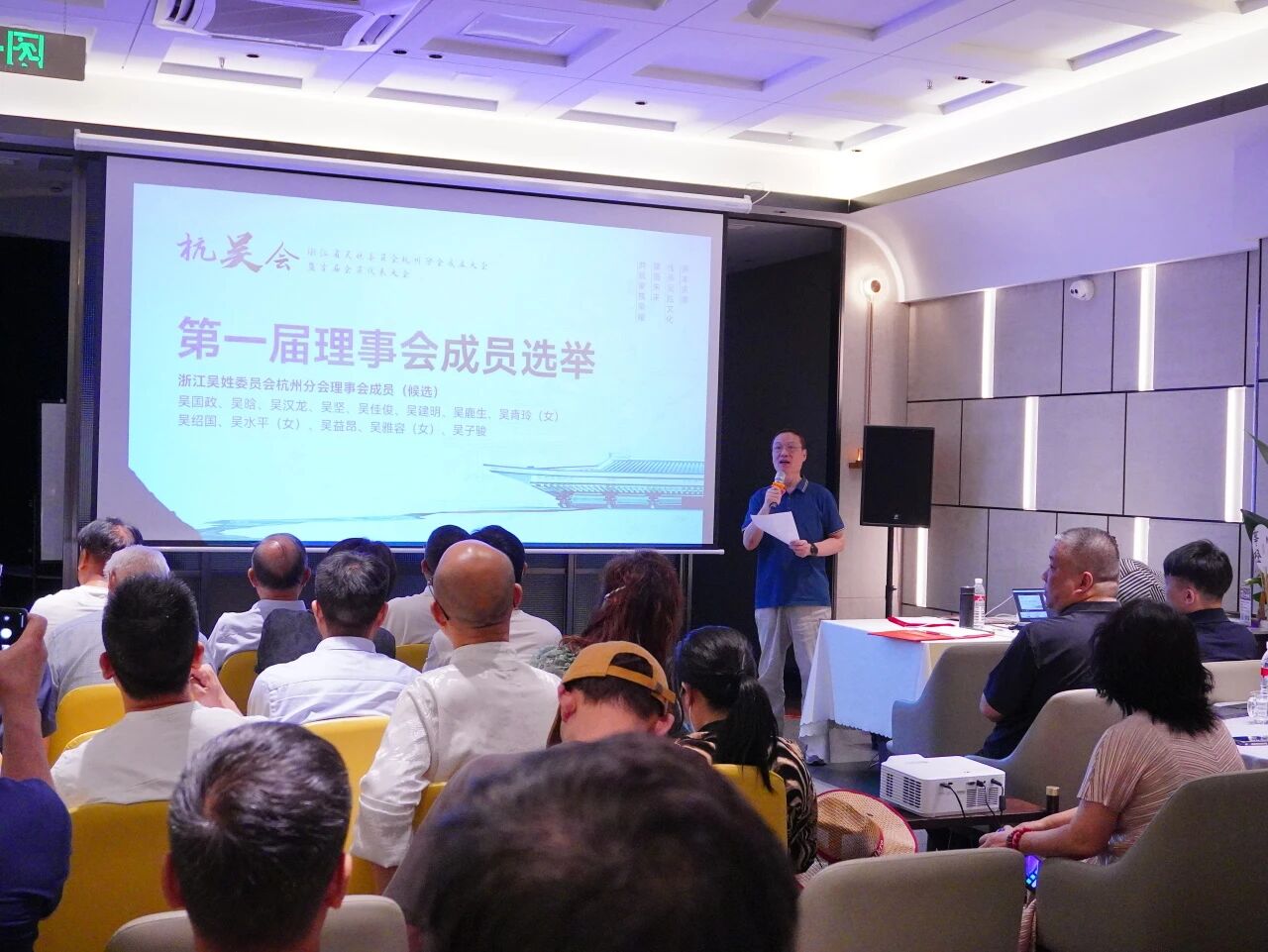 下午三时,大会在热烈庄重的氛围中拉开帷幕。筹备小组副组长吴国政作筹建工作报告,全面回顾分会筹备历程。自2025年上半年成立筹备小组以来,在浙江吴姓委员会指导下,严格按照《社会团体登记管理条例》,历时数月完成三大核心任务:一是走访杭州吴氏宗亲,建立宗亲信息数据库,核验创始会员身份,奠定规范化发展基础;二是起草章程草案,确立“弘扬祖德、敦亲睦族、造福宗亲、服务社会”的办会宗旨;三是组建专家智库,涵盖家谱研究、产业协作、公益慈善等领域,形成“三位一体”组织架构。这一系列扎实举措,为分会的规范化运作奠定坚实基础。